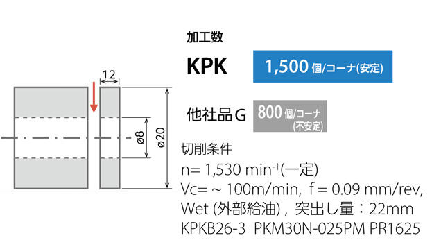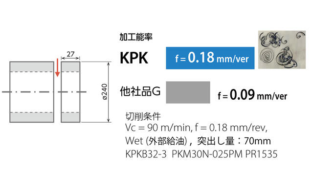 KPKで加工能率2倍を達成。送りをアップしても切りくず処理・仕上げ面品位が良好だった。インサート取付が容易で操作性も改善した(ユーザー様の評価による)