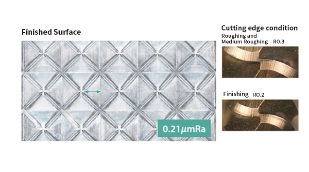 Delivers excellent performance in the machining of STAVAX (52 HRC) 8mm x 4mm die and mold parts. Surface finish and cutting edge condition were also good. Total machining time was 3 hours 20 minutes.
