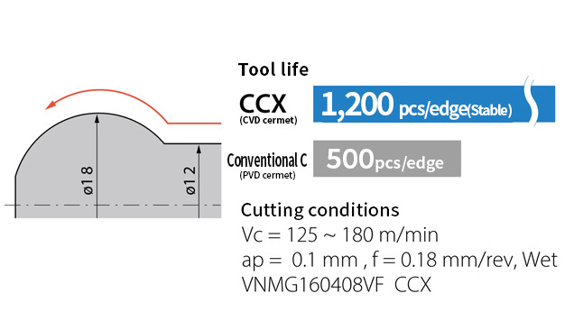 Achieves 2.4 times longer tool life than conventional PVD cermet. Stable tool life (Customer evaluation).