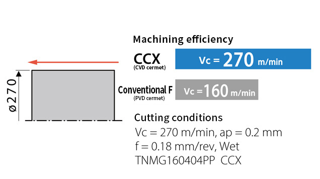 Achieves high-speed machining at Vc = 270 m/min, achieving 1.6 times Machining efficiency of competitors' PVD cermet. Tool life has also been significantly improved (Customer evaluation).
