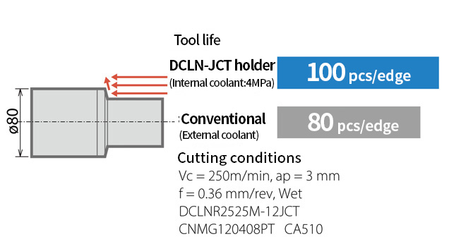 DCLN-JCT Internal coolant machining achieves 1.25 times longer Tool life than External coolant (Customer evaluation).