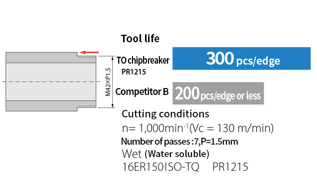 Achieved a 1.5x longer tool life with the TQ chipbreaker (PR1225). Chip evacuation was also good.