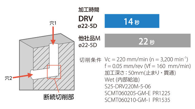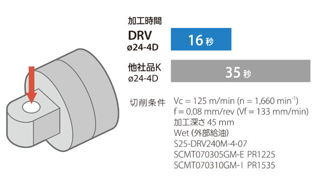 他社品はびびりが発生し、公差穴部分ではさらに振動が大きくなった。DRVは切削速度をアップしてもびびりが発生せず振動も低減。加工能率1.5倍を達成した。