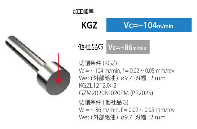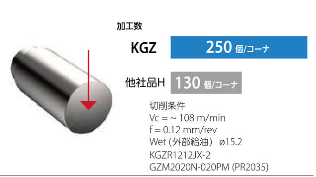 ステンレス鋼の加工で寿命1.9倍を達成。他社品では溶着が発生していたが、KGZでは溶着なく切りくず処理も良好だった (ユーザー様の評価による)