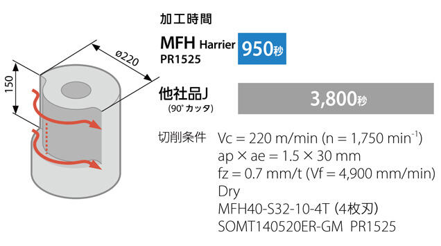他社品Jに対しPR1525はパス数が増加したが、送りを7倍にすることが可能となり加工時間が75%短縮された
