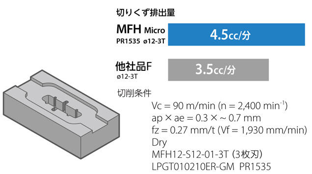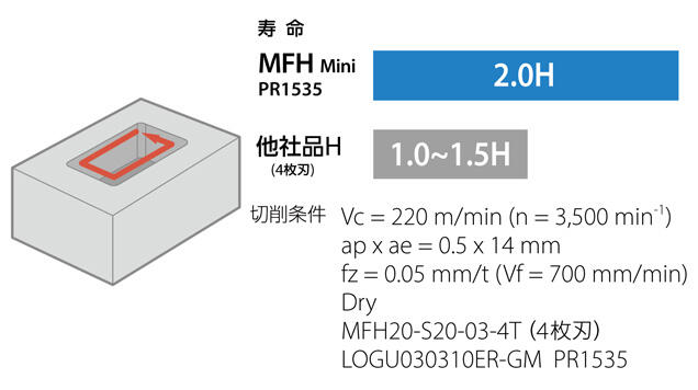 PR1535は他社品Hに対し切削負荷が低く、加工時間を延長することが可能